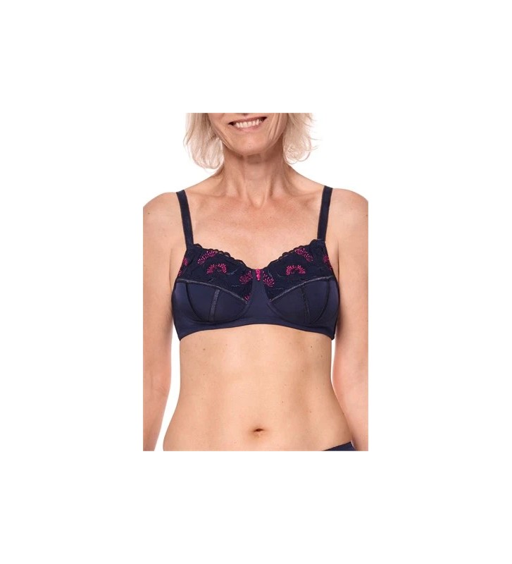 Le modèle DELILA soutien-gorge sans armatures allie confort et élégance. Le haut des bonnets est sublimé par une délicate broderie florale en couleur contrastante, tandis que le tulle élastique crée un décolleté raffiné. Les bonnets en microfibre douce sont rehaussés d’une fine bande brillante, apportant une touche de sophistication. Des poches intérieures en tissu microfibre respirant, à régulation thermique, assurent un confort optimal au quotidien. Les bretelles élastiques, ajustables, sont ornées d’anneaux et de glissières en ton magenta pour une touche de couleur subtile. Fermeture arrière rembourrée et douce pour un maintien tout en douceur.
