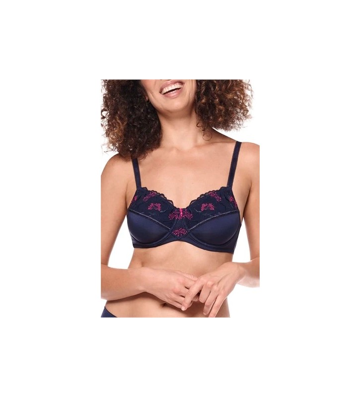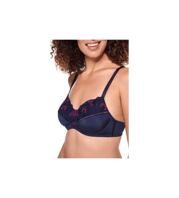Soutien-gorge DELILA à armatures avec broderie florale sur le haut des bonnets et au centre du décolleté. Le tulle élastique souligne un décolleté élégant. Bas des bonnets et côtés en microfibre pour un confort optimal. Bandes décoratives brillantes et plates dans la couture croisée et sur les côtés, sans volume. Poches en microfibre respirante à régulation thermique. Bretelles élastiques ajustables avec anneaux et glissières magenta. Fermeture arrière douce et rembourrée.